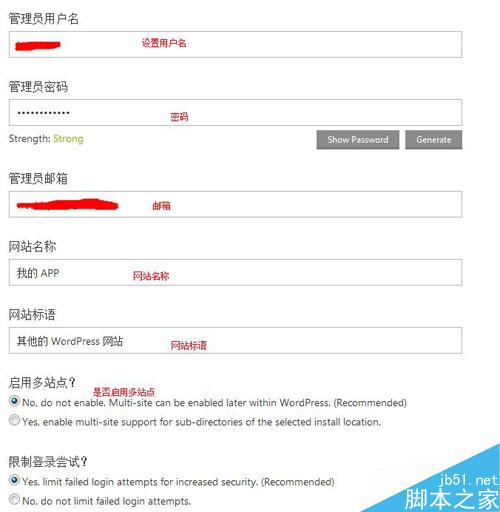 b.设置WordPress的后台登陆用户名、密码和管理员邮箱等信息。