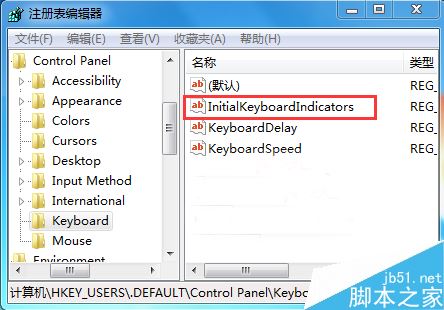 2、在打开的注册表编辑器找到HKEY_USER/.default/Control Panel/Keyboard,然后在右侧窗口中找到InitialKeyboardIndicators值