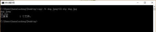 接着打开命令行,进入桌面路径,以我的文件为例,输入copy/bdog.jpeg+12.zipdog.jpg,其格式是:图片名称+被隐藏文件名输出的文件名。
