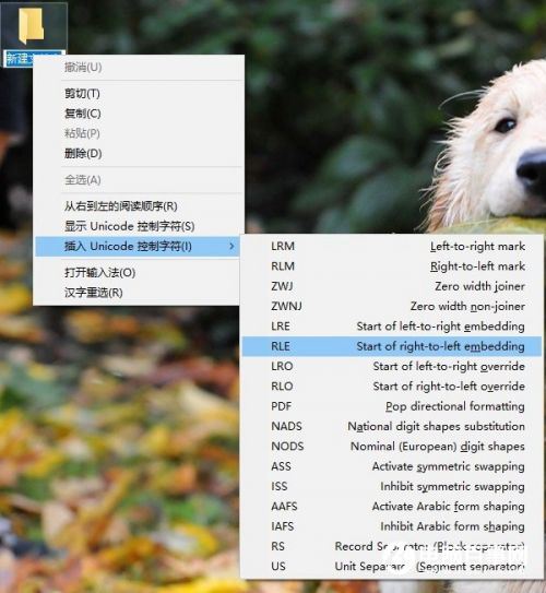 二、接着为其重命名,选择「插入Unicode控制字符」,如下图所示。