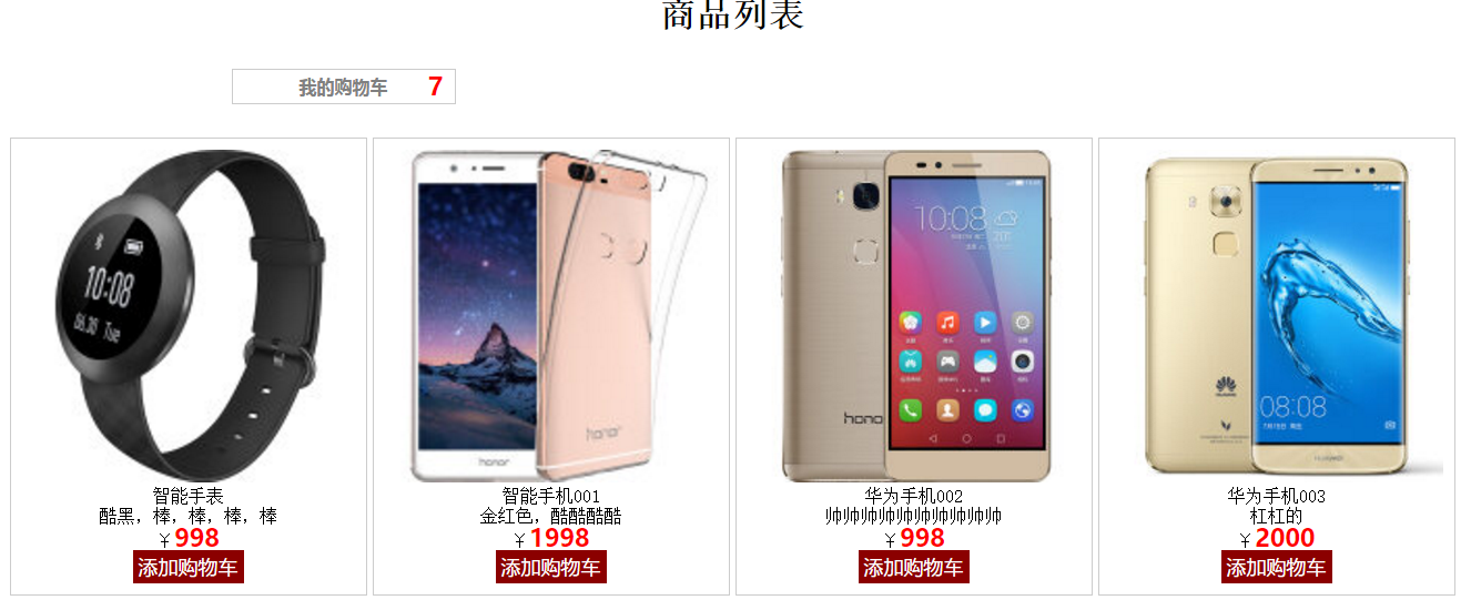 <!DOCTYPE html> <html> <head> <meta charset="utf-8" /> <title>商品列表页面</title> <!--商品列表样式表--> <link rel="stylesheet" type="text/css" href="../css/index.css" rel="external nofollow" /> <!--cookie操作的js库--> <script src="../js/cookie.js" type="text/javascript" charset="utf-8"></script> </head> <body> <div class="container"> <h1>商品列表</h1> <div class="mycar"> <a href="cart.html" rel="external nofollow" >我的购物车</a><i id="ccount">0</i> </div> <div class="list"> <dl pid="1001"> <dt> <img src="../images/p1.jpg" /> </dt> <dd>智能手表</dd> <dd>酷黑,棒,棒,棒,棒</dd> <dd>¥<span>998</span></dd> <dd> <button>添加购物车</button> </dd> </dl> <dl pid="1002"> <dt> <img src="../images/p2.jpg" /> </dt> <dd>智能手机001</dd> <dd>金红色,酷酷酷酷</dd> <dd>¥<span>1998</span></dd> <dd> <button>添加购物车</button> </dd> </dl> <dl pid="1003"> <dt> <img src="../images/p3.jpg" /> </dt> <dd>华为手机002</dd> <dd>帅帅帅帅帅帅帅帅帅帅</dd> <dd>¥<span>998</span></dd> <dd> <button>添加购物车</button> </dd> </dl> <dl pid="1004"> <dt> <img src="../images/p4.jpg" /> </dt> <dd>华为手机003</dd> <dd>杠杠的</dd> <dd>¥<span>2000</span></dd> <dd> <button>添加购物车</button> </dd> </dl> </div> </div> <!-- 描述:数据访问层,操作本地数据的模块 --> <script type="text/javascript" src="../js/server.js"></script> <!-- 描述:本页面的js操作 --> <script type="text/javascript" src="../js/index.js"></script> </body> </html>