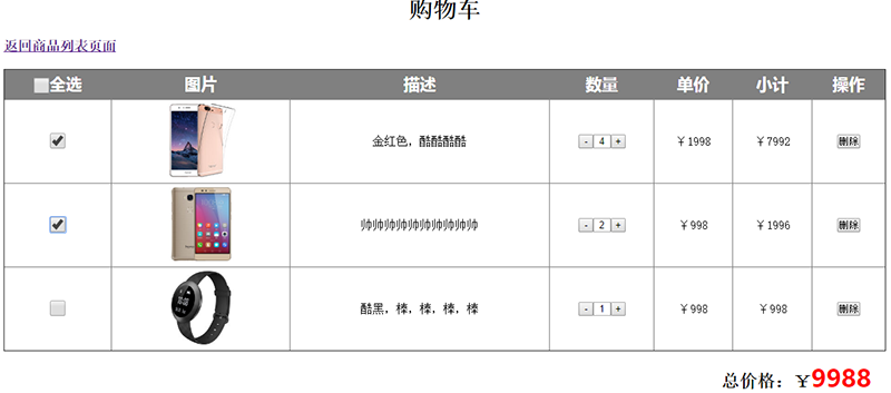 上述代码完成了购物车中的相关操作,比如价格计算,商品数量更换,商品删除等操作。