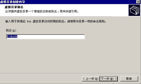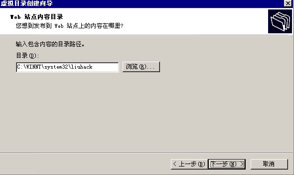 选中“liuqq”目录,点击右键->“新建”->“虚拟目录”,给这个虚拟目录取名为“liuyes”,把这个虚拟目录指向“x:\windows\system32\liuhack”(如图一),建立完成。