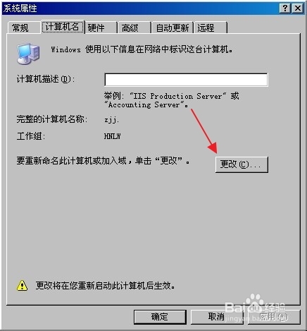 在“计算机名称更改”窗口中,在隶属于工作组的方框中,输入你想要创建的,或想要加入的工作组名称,确定,然后重启计算机即可生效。