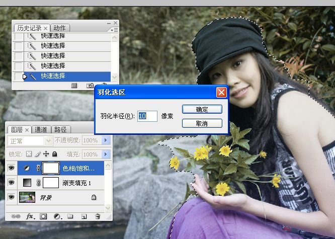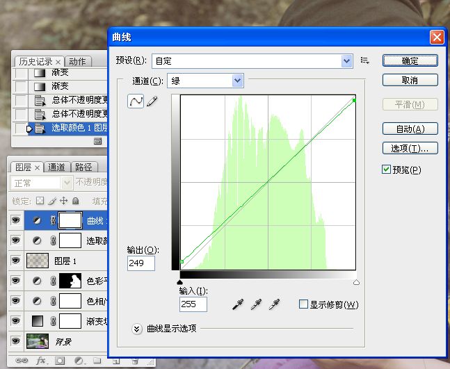 本例看似复杂,其实只要把握好曲线、可选以及色相饱和度这三个调色工具,也就变得简单多了,这三个调色工具主要对画面中的绿色和人物的肤色进行调整,把绿色的成分去色,黄色补上来。同样,人物的肤色也是如此,把人物肤色红色成分减淡,黄色加上来。这种柔和暖暖的淡黄色,比较适合唯美的女生写真。