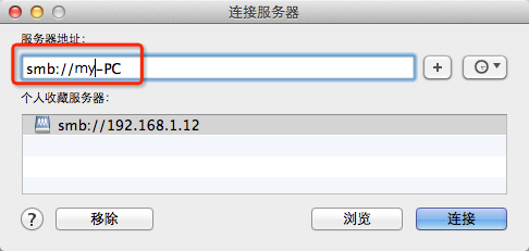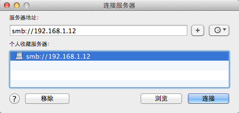 2、在连接服务器对话框中输入「smb://Windows主机的IP地址」,其中 smb 是访问 Windows 共享文件夹所使用的协议名称,SMB:服务器信息块协议(Server Message Block protocol)。