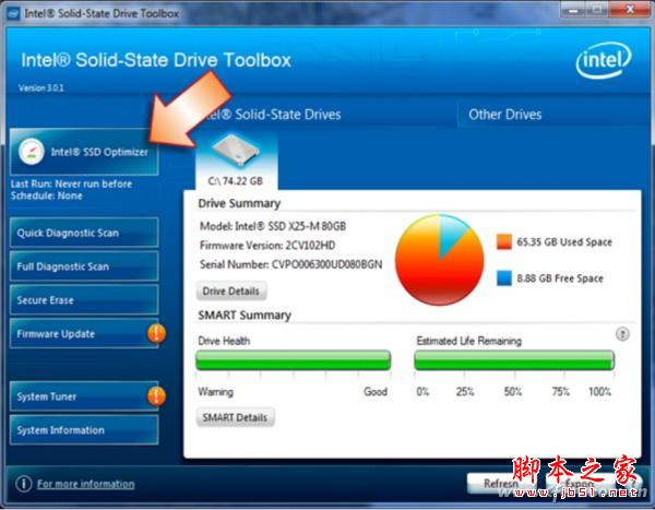 接着还可以使用优化工具对SSD硬盘进行读写优化(包括前面介绍的4K对齐)。以英特尔SSD硬盘为例,到官方网站下载“SSD工具箱”,程序运行后会自动检测到当前SSD硬盘,点击软件左侧窗格的“Firmware Update”,升级SSD固件(图7)。
