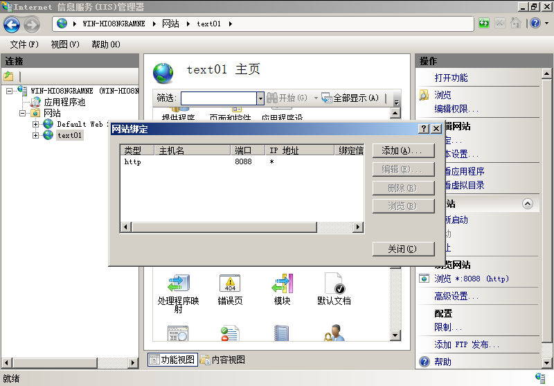 3、保存后返回,选择右侧边绑定,然后选择编辑 ,修改网站端口,80(默认)或其他端口,建议使用默认80端口。也可以设置默认站点IP地址。