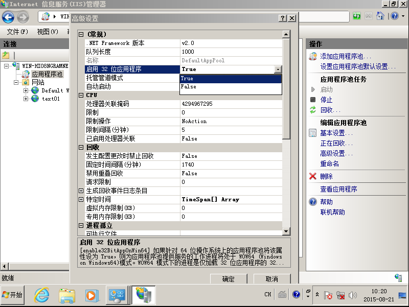 5、返回,点击左边应用程序池节点,查看刚才使用的应用程序池的高级属性(这里是DafaultAppPool)。