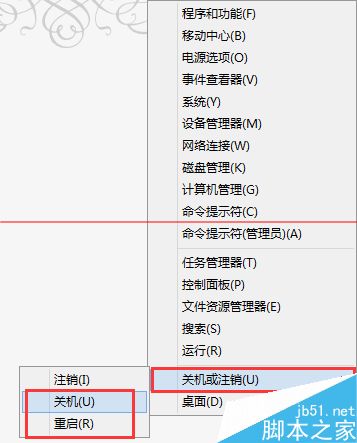 4、右击开始按钮,然后选择 关机或注销,重启,重新启动电脑: