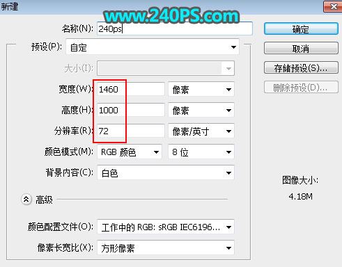 1、打开PS软件,按Ctrl + N 新建画布,尺寸为1460 * 1000,分辨率为72像素/英寸,如下图,然后确定。