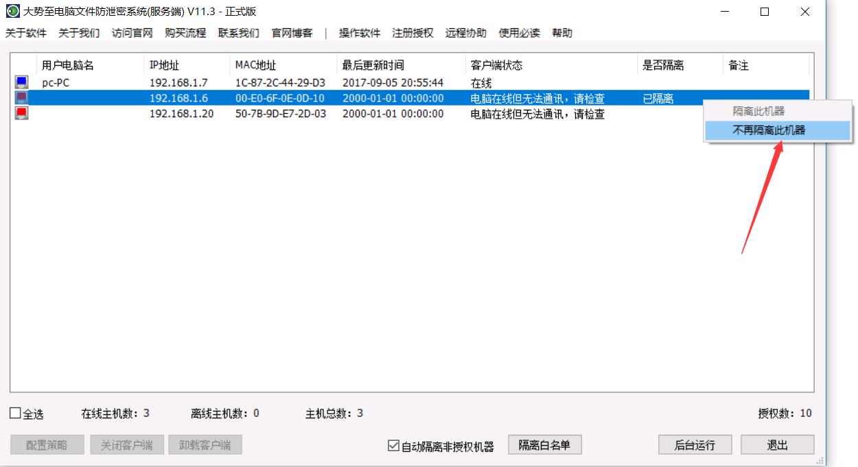 当然,你可以右键在被隔离电脑上选择“不再隔离此主机”即可取消隔离,如下图所示: