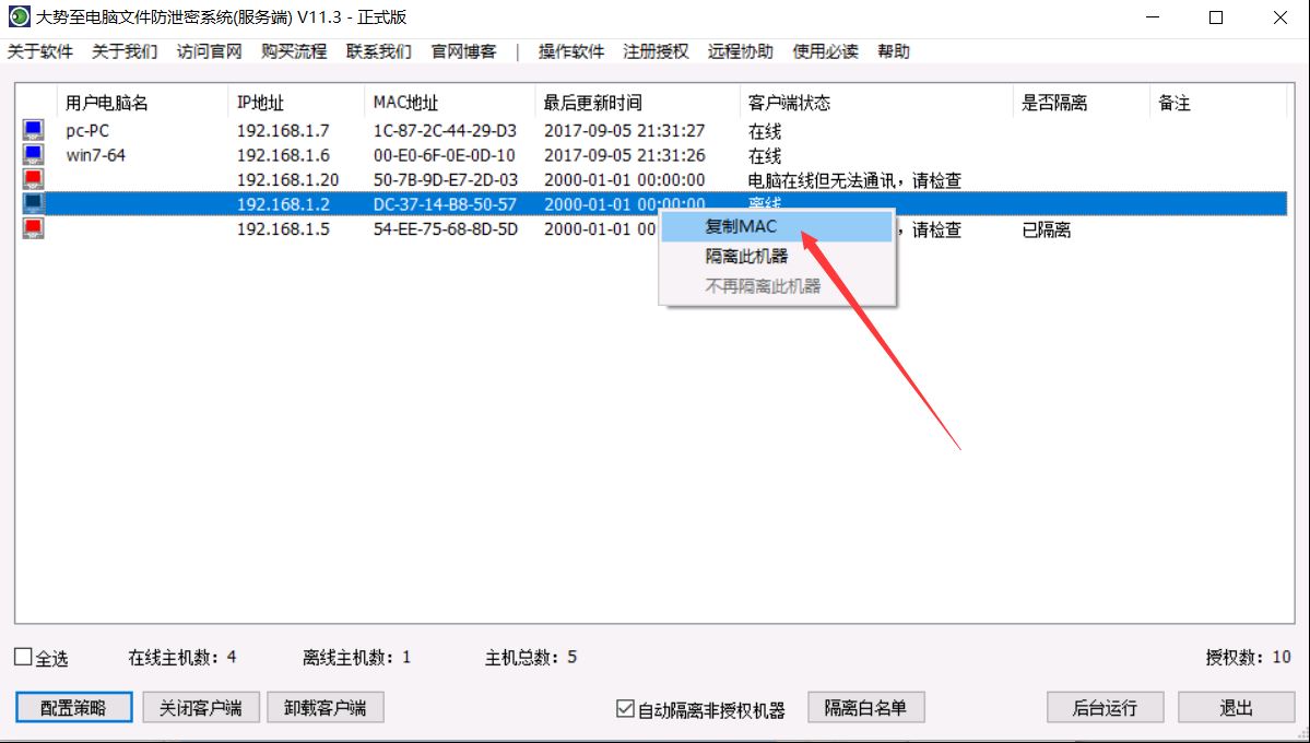 同时,添加MAC地址的方法也不用手工输入,可以在软件的主机列表的某个主机上面右键点击,然后点击“复制MAC”即可,然后在刚才MAC地址输入窗口这里粘贴,添加,保存即可。如下图所示: