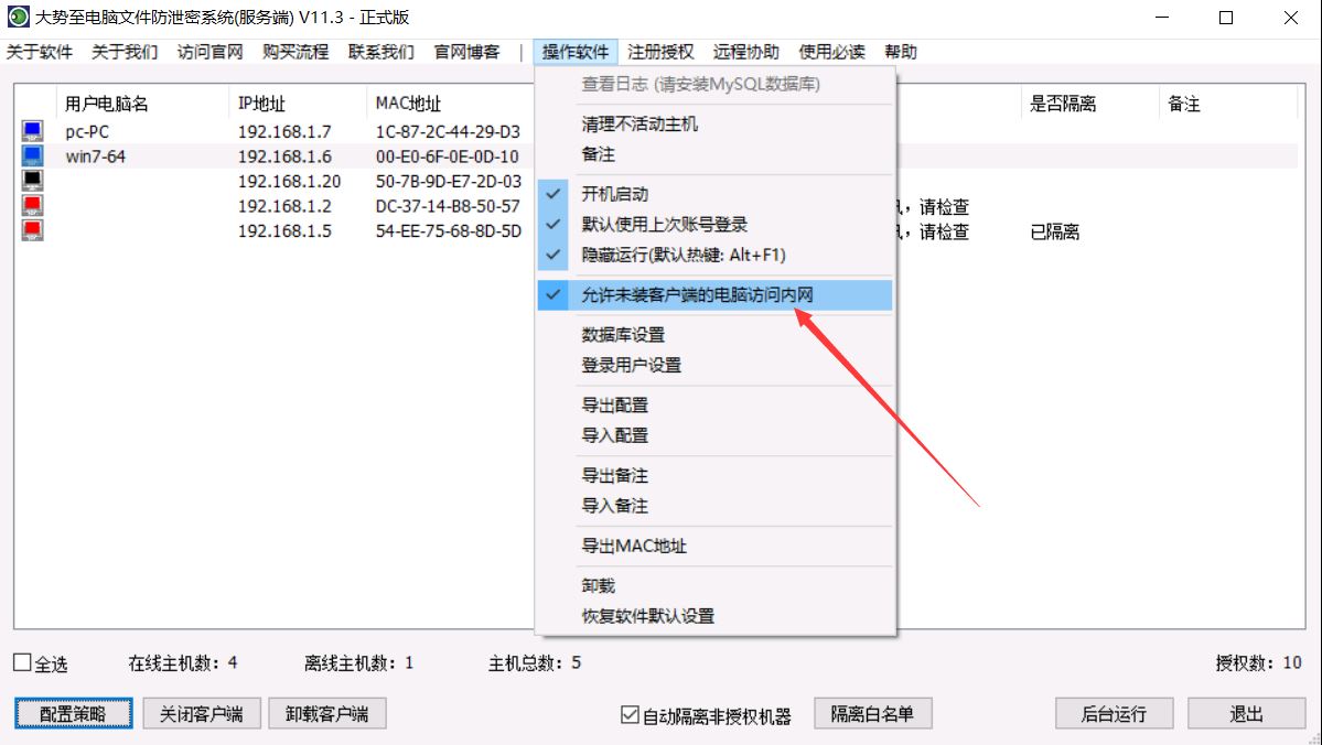 6、管理员可以设置允许未经授权电脑访问内网的功能