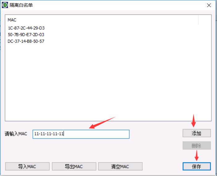 然后点击后面的“隔离白名单”,然后输入MAC地址,点击“添加”,然后点击“保存“即可”,则如下图所示: