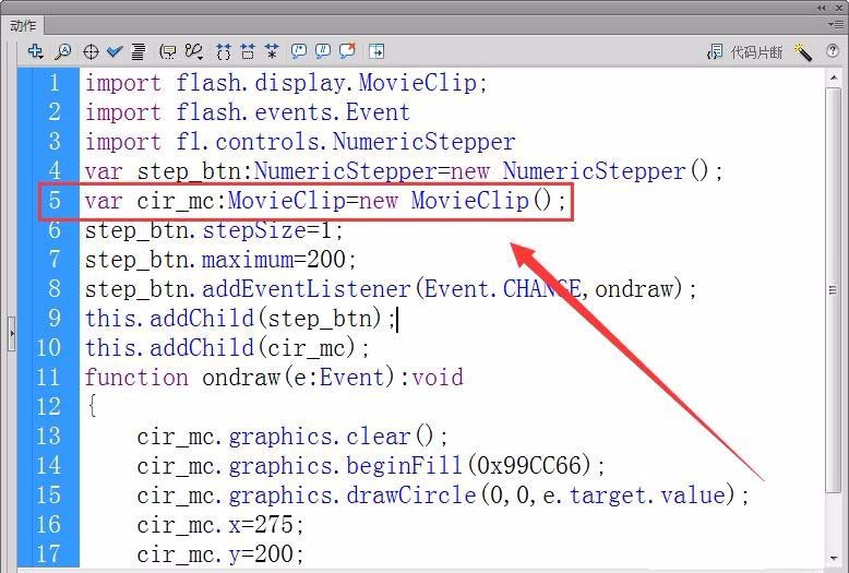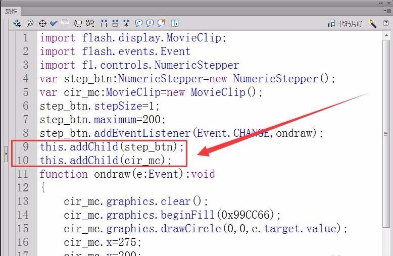 6、将实例step_btn添加到显示列表中,把影片剪辑元件cir_mc添加到显示列表中,使舞台能正常控制和显示绘制圆形。