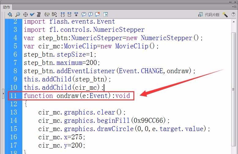 12、运行程序,更改步进器的值,Flash舞台就会自动绘制出相应半径的圆形。