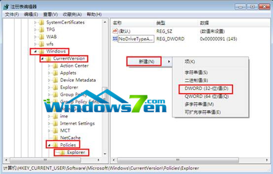 2.打开注册表编辑器,左边栏目中依次进入HKEY_CURRENT_USE\software\Microsoft\Windows\CurrentVersion\Po-licies\Explorer,选中Explorer,在右侧窗口中按下鼠标右键,在右键菜单栏中选择“新建” ,“DWORD值”,如图2所示: