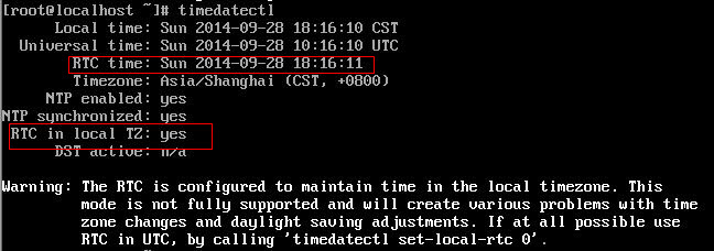 注意 硬件时钟默认使用UTC时间,因为硬件时钟不能保存时区和夏令时调整,修改后就无法从硬件时钟中读取出准确标准时间,因此不建议修改。修改后系统会出现下面的警告。