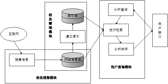 搜索引擎是“对网络信息资源进行搜集整理并提供信息查询服务的系统,包括信息搜集、信息整理和用户查询三部分”。如图1是搜索引擎的一般结构,信息搜集模块从网络采集信息到网络信息库之中(一般使用爬虫);然后信息整理模块对采集的信息进行分词、去停用词、赋权重等操作后建立索引表(一般是倒排索引)构成索引库;最后用户查询模块就可以识别用户的检索需求并提供检索服务啦。