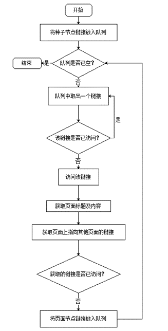 主要搜集以下内容:目标网页的标题、目标网页的主要文字内容、目标网页指向其他页面的URL地址。网络爬虫的工作流程如图2所。爬虫的主要数据结构是队列。首先,起始的种子节点进入队列,然后从队列中取出一个节点访问,抓取该节点页面上的目标信息,再将该节点页面指向其他页面的URL链接放进队列,再从队列中取出新的节点进行访问,直至队列为空。通过队列“先进先出”的特点实现广度优先的遍历算法,逐个访问站点的每一页面。