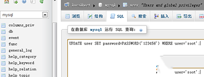 在浏览器地址上输入http://localhost/phpmyamdin 进入到数据库控制面板,然后选择名称为mysql数据库,如图,可从中看出 user表中,root的两个用户的密码为空。