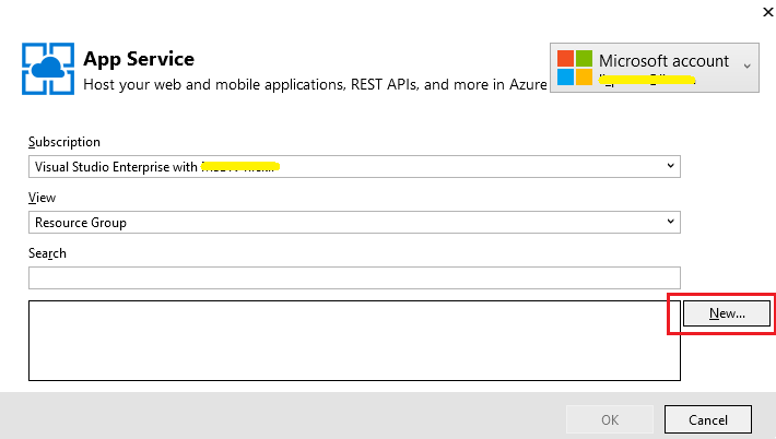 这一步需要您输入您的MS订阅账号(Azure上的一切资源都是通过您的账号进行管理的),登录完成后点击 new 按钮开始创建过程: