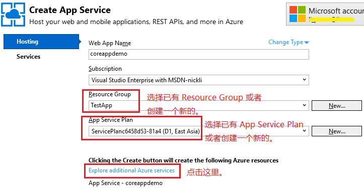 默认的 Service 类型就是 Web App,所以不需要再进行配置。下面选择或者创建 Resource Group/App Service Plan。这里稍微解释一下,Resource Group 是资源管理的逻辑单位,可以通过 Resource Group 管理其包含的资源,主要是进行授权。App Service Plan 简单点说就是管理您的资源分配,您花费一块钱和十块钱显然是会分配到不同的资源。然后点击“Explore additional Azure services”开始创建数据库。