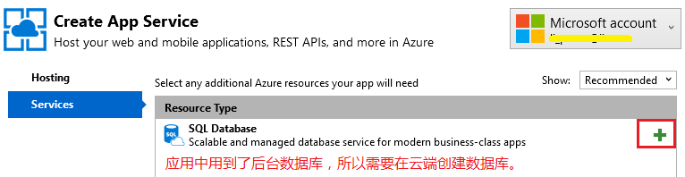 我们的应用中用到了数据库,所以需要在 Azure 上创建数据库。现在进入数据库创建流程,点击右侧绿色的加号:
