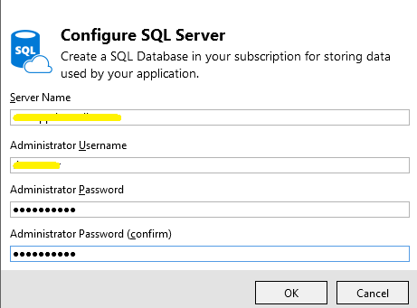 下面是创建新的数据库服务器的界面,请输入合适的数据库服务器名称,并设置好您的用户名和密码,然后点击 OK 按钮: