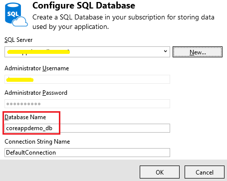 接下来又回到了创建数据库的界面,此时的数据库服务器已经设置好了,只要再输入数据库的名称就可以了。然后点击 OK 按钮进入下一步: