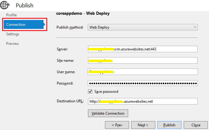 在完成了 Azure Web App 的创建后我们回到部署过程。在 Connection 选项卡中,其实我们看到的设置都是默认值,没有特殊要求的话是不需要修改的。点击进入Settings 选项卡: