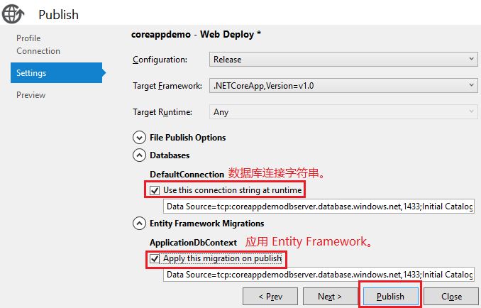 基本的配置使用默认值就可以了。我们需要选择使用数据库的连接字符串,和 Apply this migration on publish 就可以了。然后点击 Publish 按钮完成往云端的发布: