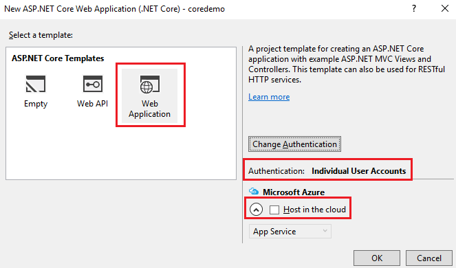 在新建 ASP.NET Core Web Application (.NET Core) 对话框中选择 “Web Application” 模板。然后修改 Authentication 的类型为 “Individual User Accounts” 。此时通过模板创建的应用就会包含用户管理的模块。同时取消 “Host in the cloud” 的选项,然后点击 OK 按钮。