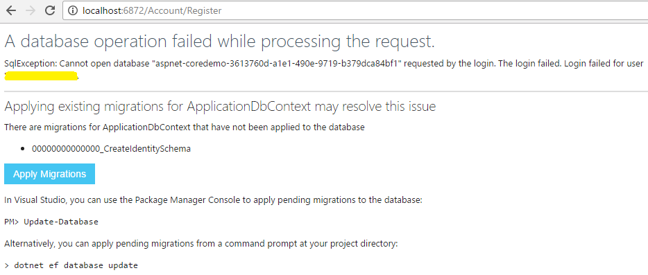 按 F5 在本地运行 demo 应用,点击 “Register” 去注册一个新的用户。当您填完信息并按下 “Register” 按钮后会收到下面的错误: