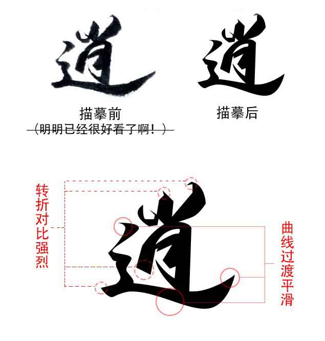 走到第二步的时候,有些朋友可能觉得已经不错了,抠出来就可以直接用了。这可以根据自己的想法自由控制。这一步的主要目的是提升毛笔字的可识别性和修饰不自然曲线,便于设计slogan。先不要关注飞边的造型,而是根据字形结构用钢笔进行描摹。起笔,转折处线条要坚实有力。我们以“逍”字的描摹举一个例子: