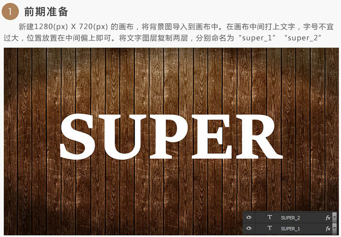 1、新建1280 * 720的画布,将背景图导入到画布中。在画布中间打上文字,字号不易过大,位置放置在中间偏上即可。将文字图层复制两层,分别命名为“super-1”,“super_2”。