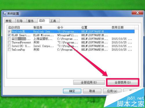 6、在禁用程序启动项时,也可以使用“全部禁用”按钮。
