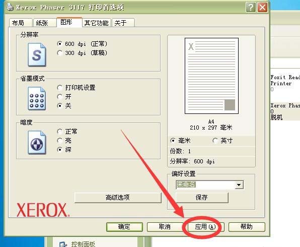 3、在弹出的界面中点按图形选项卡,按下图设置分辨率、省墨模式和暗度,然后点按应用。