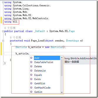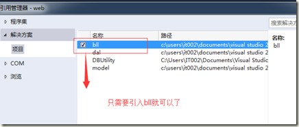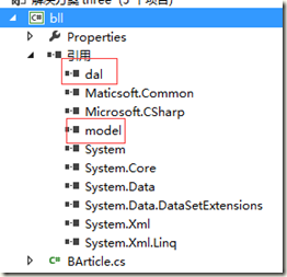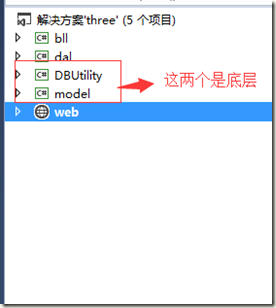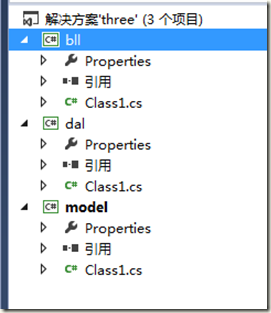 总结:三层一般为web(试图层),bll(业务逻辑层),dal(数据访问层),引用顺序是 web引用bll,bll引用dal,中间还有一个model(模型层)作为承载数据的媒介,供上面三个层引用。