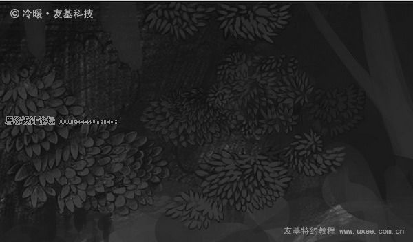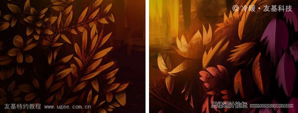9.接下来就是树叶了,这是一个非常占用时间的过程,大部分叶子都需要一片片地去刻画,因为我希望每一片都和其它的不重复。不过在我绘制了很多很多叶子后,终于受不了那样的折磨,于是就在一些比较阴暗的角落用了仿制图章工具复制了一些叶子,下面两张就是叶子绘制前后的对比图:
