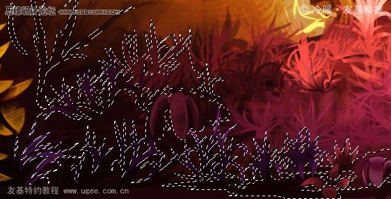 调出选区后我们给草的根部和草尖绘制出不同的颜色,为了更直观一点,我们可以用ctrl+h建隐藏选区,然后再继续绘制或者进行加深减淡处理,调出选区后绘制不会影响到其它地方。