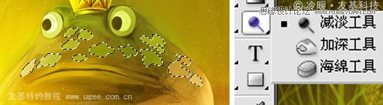 20.这时整幅画大体就差不多了,接下来的事情就是最后的调整了,比如青蛙王子的绘制还不到位。我们给青蛙王子身上加上斑点,再用PS里面的“变形”工具对斑点的形状进行调整并调出选区,调整斑点的颜色和明暗,像前面绘制草地的方法一样,使斑点比较合理地添加到青蛙王子的身上。