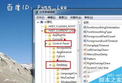5、打开后,在文本框中输入“regedit”,然后点击“确定”按钮打开注册表编辑器并定位到HKCY_CURRENT_USER\Control Panel\Desktop节点。