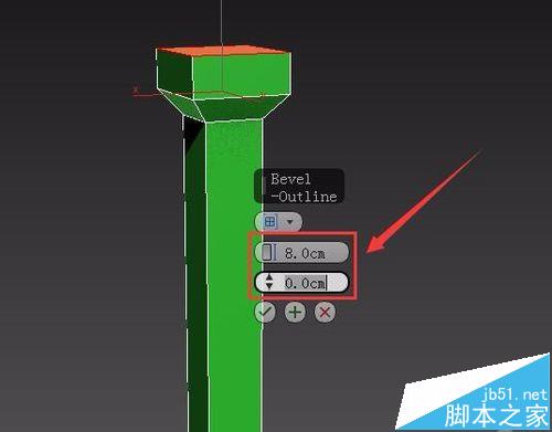 12、再次选择bevel,并点击其后的按钮,设置高度为8,轮廓为0,点击对号确定,如图所示: