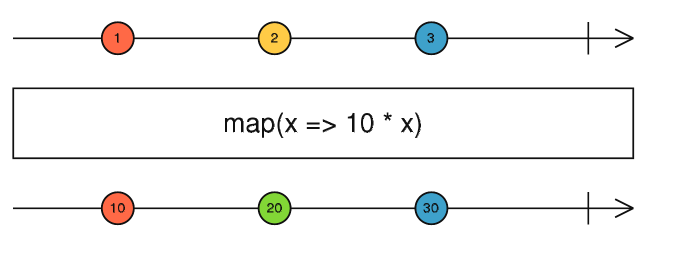 map操作是将一个序列中每次对外发射的信息做转换,如上图map将每次的发射值乘以十,那么当订阅者订阅之后每次得到的订阅值就不再是原始的123而是经过转换后的10 20 30。通过序列图能更方便的理解Observable的运算。