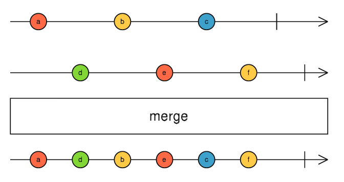 merge操作的目的是将两个独立序列,合成一个序列。原本序列1随着时间的前进,在100ms时发射a,在200ms时发射b,300ms时发射c,它的订阅者在400ms将受到abc三个值;序列2在150ms时发射d,250ms时发射e,350ms时发射f,它的订阅者在400ms内收到def三个值。而merge之后的新序列将在400ms内收到abcdef(注意顺序)。