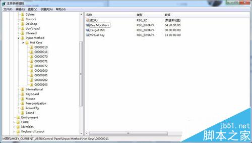 经研究发现,全/半角切换的设置信息是在下面这个项中的,00000011,在此目录下的右边窗口,修改相应名称的数值如下(这里假设将“全半角切换”的快捷方式设为“Shift+3):