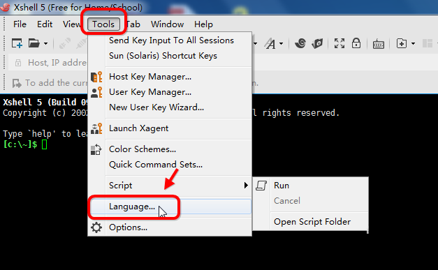 1、xshell安装好之后,默认就是英文的。怎么设置为中文?作者告诉你,打开xshell菜单栏,找到语音 languagle菜单
