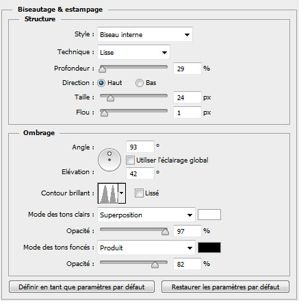 内斜面;平滑;深度29%;方向:上;大小24px;软化1px;角度93°;高度42°;光泽等高线如图;高光模式:滤色、97%;阴影模式:正片叠底、82%